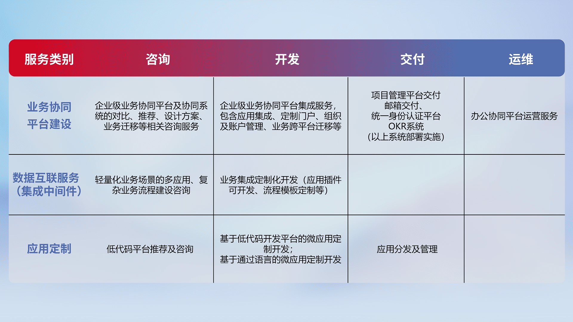 针对钉钉、、、企微、、、、IDaas等平台级产品提供产品的规划、、、、方案、、、交付、、定制化开发等服务,,实现如统一协同办公、、、智能客户服务、、混合会议管理、、、、智能数据查询、、等业务场景,,实现数字化转型。。