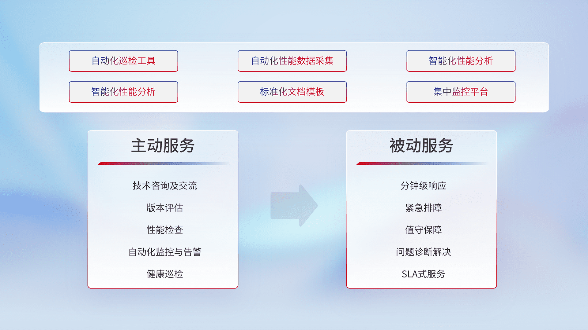 智能化工具和标准化文档,,,,保障服务质量,,,,提供主动服务(包含技术咨询、、版本评估、、、性能检查、、、自动化监控与告警、、、、健康巡检)和被动服务包含(分钟级响应、、紧急排障、、值守保障、、、问题诊断解决、、SLA服务)。。